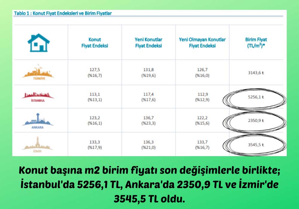 Veriler, bankaların sunduğu düşük faizli kredi avantajlarının konuta olan tabebi artırdığını ve bunun da fiyatlara artı yönlü yansıdığını gösterdi.Konut başına m2 birim fiyatı Türkiye genelinde 3143,6 TL oldu.