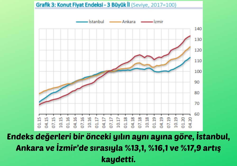 Endeksin bir önceki yıl olan 2019’un aynı ayına kıyasla değişimi ise %16,7’lik nominal artışa işaret etti. Mart’ta geçtiğimiz yılın aynı ayına göre %15,01 artmıştı. Yıllık bazda %16,7 artan KFE ‘nin söz konusu dönemdeki reel değişimi ise %5,2 artış oldu.İstanbul, Ankara ve İzmir’i kapsayan 3 büyük şehrin konut fiyat endeksleri sırasıyla %1,7, %1,9 ve %1,0 oranında arttı.